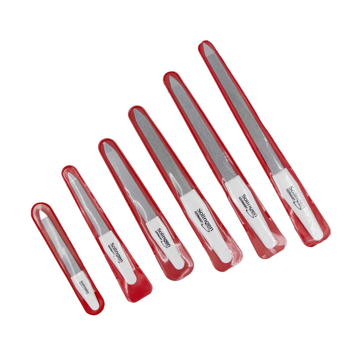 Profi Nagelfeilen aus Solingen mit Kunststoffgriff in Weiß. Das Set besteht aus drei unterschiedlich langen Feilen und ist ideal geeignet, um Finger- als auch Fußnägel zu feilen. Die Feile besitzt eine raue Seite (für scharfe Nagelkanten) und eine feine Seite (zum Abrunden & Glätten der Nägel) aus Saphirbeschichtung. Die Feilen sind in Solingen hergestellt (Made in Germany) und zeichnen sich durch hohe Lebensdauer und Robustheit aus.